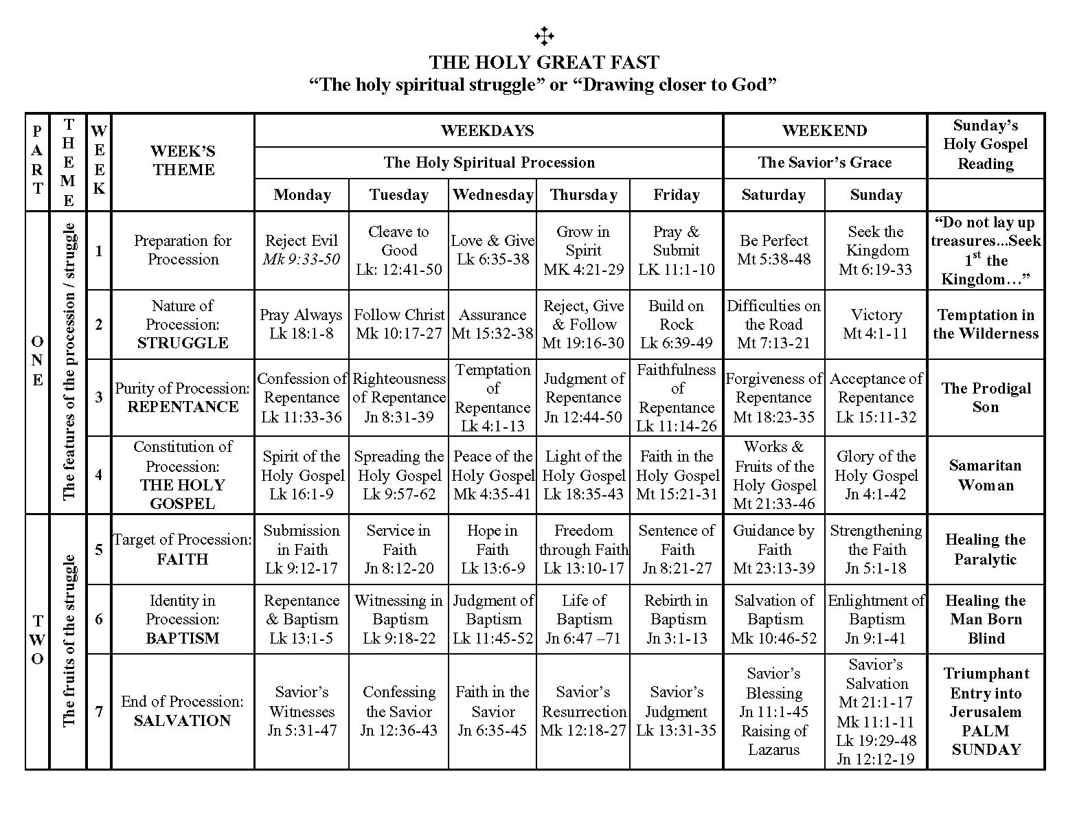 remember the value of fasting during this period. On the surface, we abstain from food, drink, delicacies, and other pleasures; however, this is done to express the love, commitment, and sacrifice we offer up to God who sent His Only-Begotten Son to die for us[2]. In addition to fasting and sacrificing to express our devotion and commitment to God, we take this blessed opportunity to grow spiritually and avoid the sinful distractions that may pull us away from our holy state. This is done by increasing the times we pray and contemplate. To help us do this, the church provides an organized set of themes and Gospel readings for the first forty nine days of the Great Lent for us to follow[4].